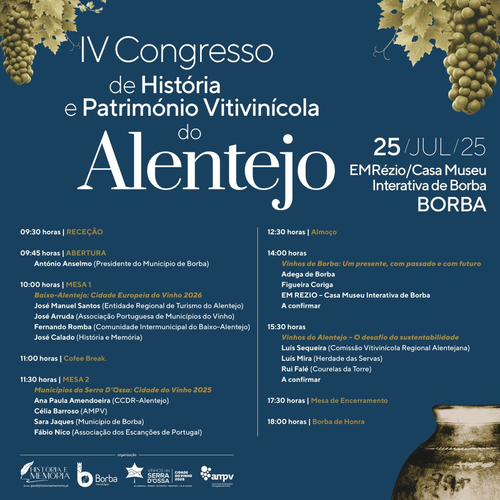 Depois do sucesso das três edições anteriores, em Redondo, Estremoz e Vidigueira, a cidade de Borba receberá no próximo dia 25 de julho o IV Congresso de História e Património Vitivinícola do Alentejo. Neste dia será debatido o passado, o presente e o futuro do Vinho do Alentejo. Inscrições gratuitas mas limitadas à capacidade da sala em:https://docs.google.com/forms/d/1YU_lnxZanPj4lIkK_PNdZzwXBCZnzmHN-n76vYGra-o/edit?pli=1